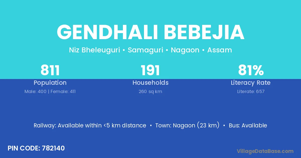 Nagaon (23 km) is the nearest town to Gendhali Bebejia village for major economic activities and is located approximately 23 km away.