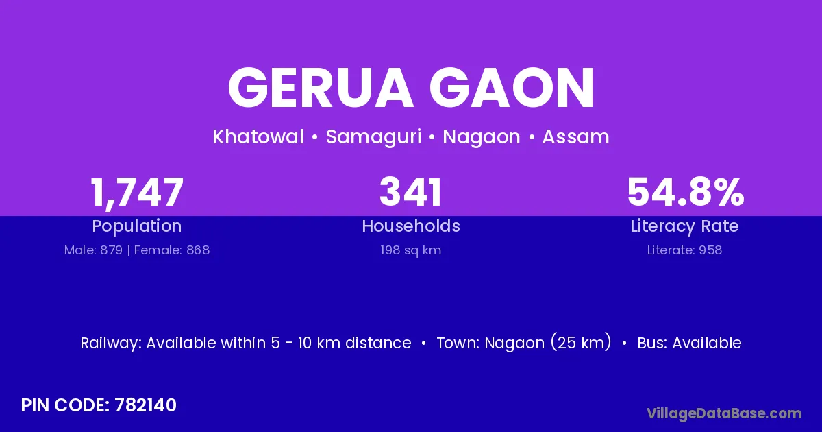 Gerua Gaon village has a total population of 1,747 people, of which 879 are males and 868 are females.
