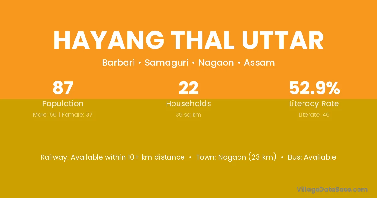 Nagaon (23 km) is the nearest town to Hayang Thal Uttar village for major economic activities and is located approximately 23 km away.
