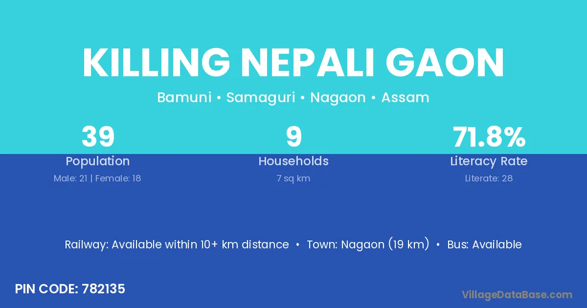 Nagaon (19 km) is the nearest town to Killing Nepali Gaon village for major economic activities and is located approximately 19 km away.