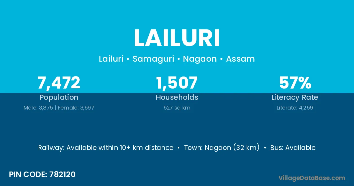 Nagaon (32 km) is the nearest town to Lailuri village for major economic activities and is located approximately 32 km away.