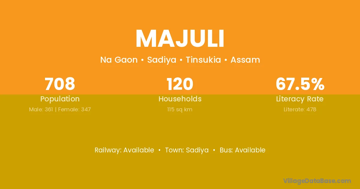 The literacy rate of Majuli village is 67.39%. Male literacy stands at 74.80% and female literacy at 58.57%.