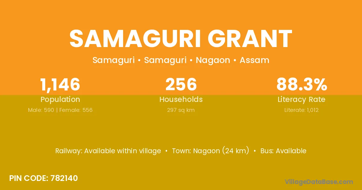 Samaguri Grant village has a total population of 1,146 people, of which 590 are males and 556 are females.