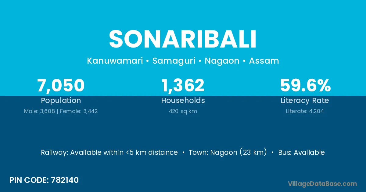 Nagaon (23 km) is the nearest town to Sonaribali village for major economic activities and is located approximately 23 km away.