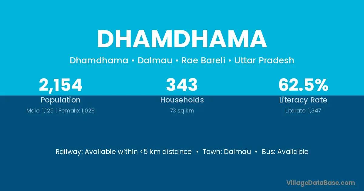 Dhamdhama village has a total population of 4,327 people, of which 2,204 are males and 2,123 are females.