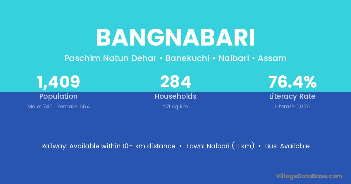 Nalbari (11 km) is the nearest town to Bangnabari village for major economic activities and is located approximately 11 km away.