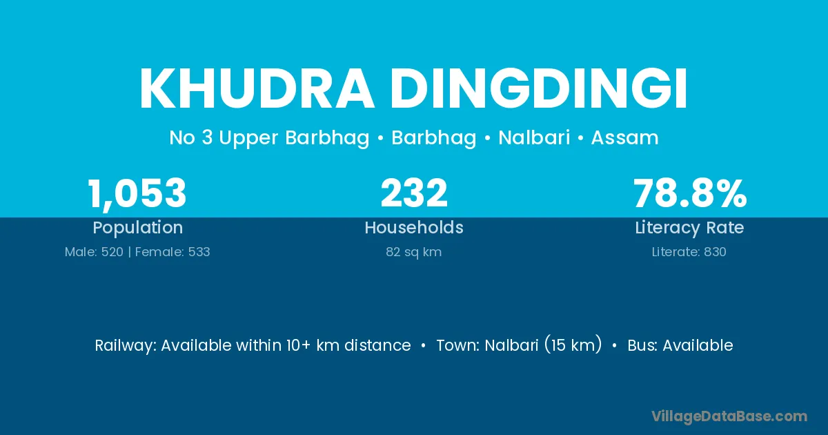 Nalbari (15 km) is the nearest town to Khudra Dingdingi village for major economic activities and is located approximately 15 km away.
