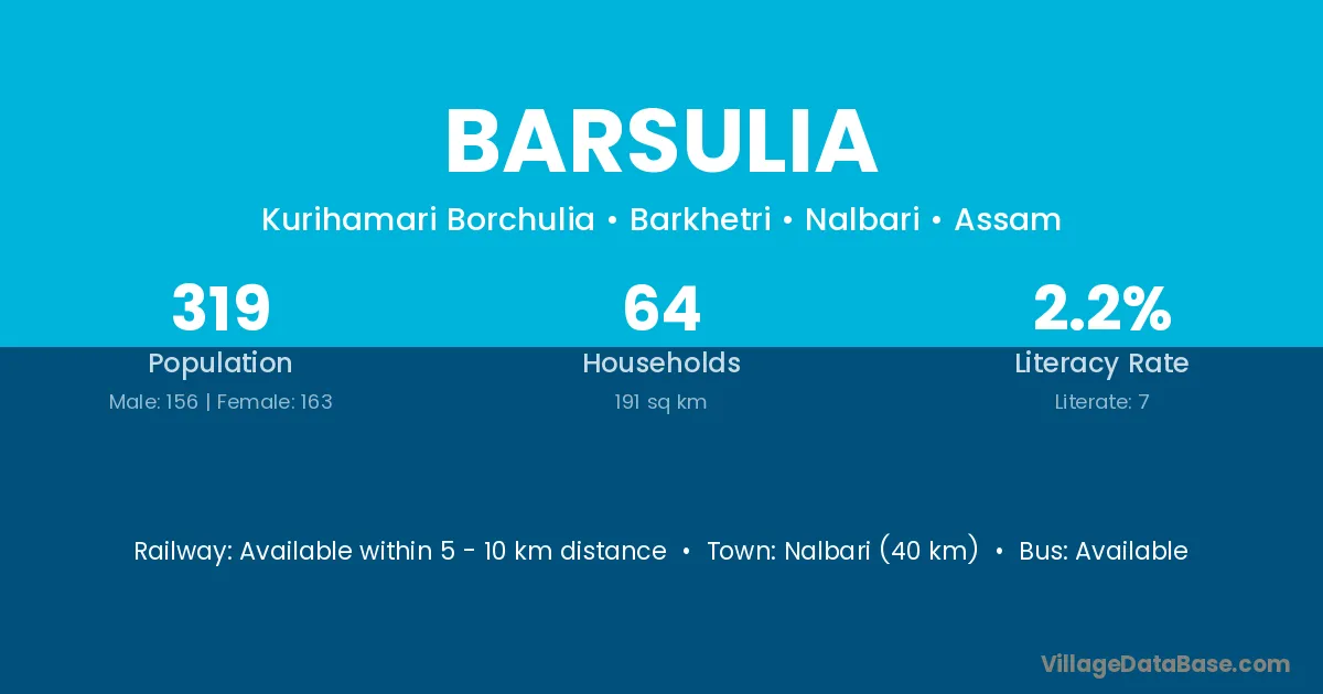 Nalbari (40 km) is the nearest town to Barsulia village for major economic activities and is located approximately 40 km away.