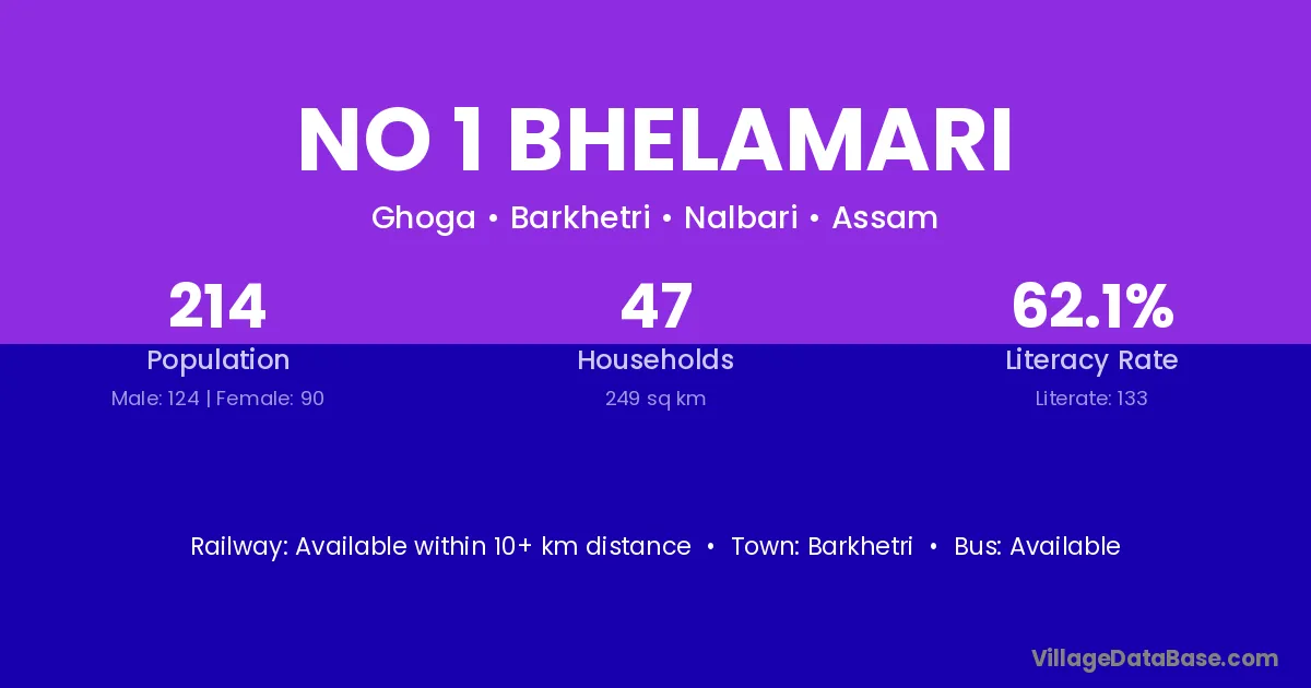 No 1 Bhelamari village has a total population of 214 people, of which 124 are males and 90 are females.