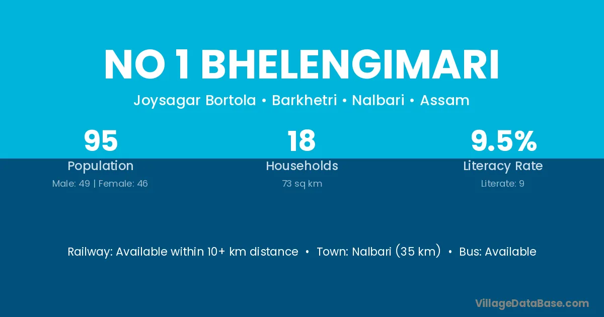 No 1 Bhelengimari village has a total population of 95 people, of which 49 are males and 46 are females.