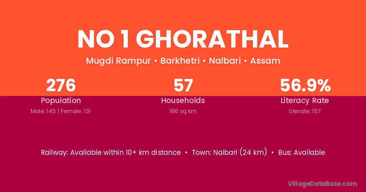 Nalbari (24 km) is the nearest town to No 1 Ghorathal village for major economic activities and is located approximately 24 km away.