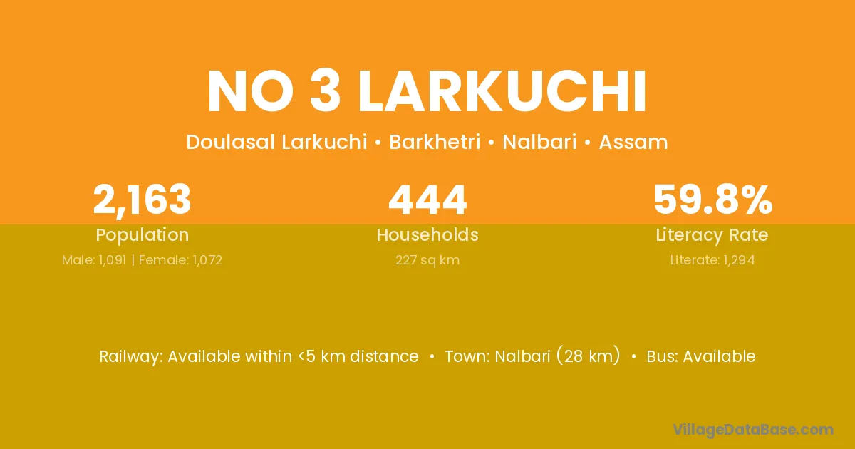 Nalbari (28 km) is the nearest town to No 3 Larkuchi village for major economic activities and is located approximately 28 km away.