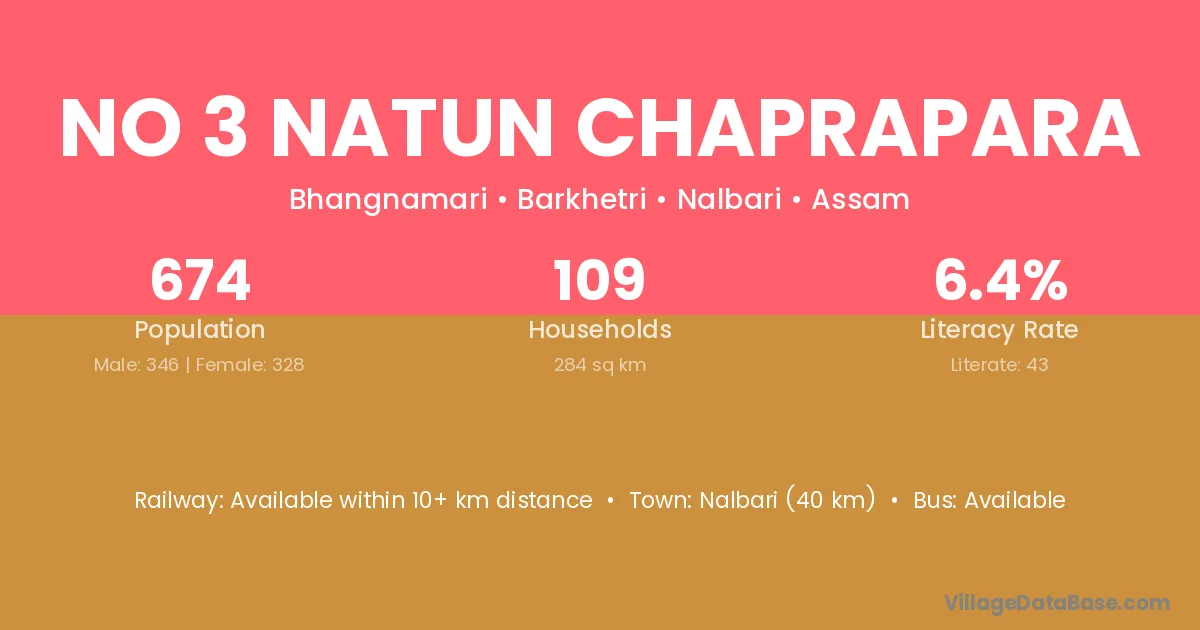 Nalbari (40 km) is the nearest town to No 3 Natun Chaprapara village for major economic activities and is located approximately 40 km away.