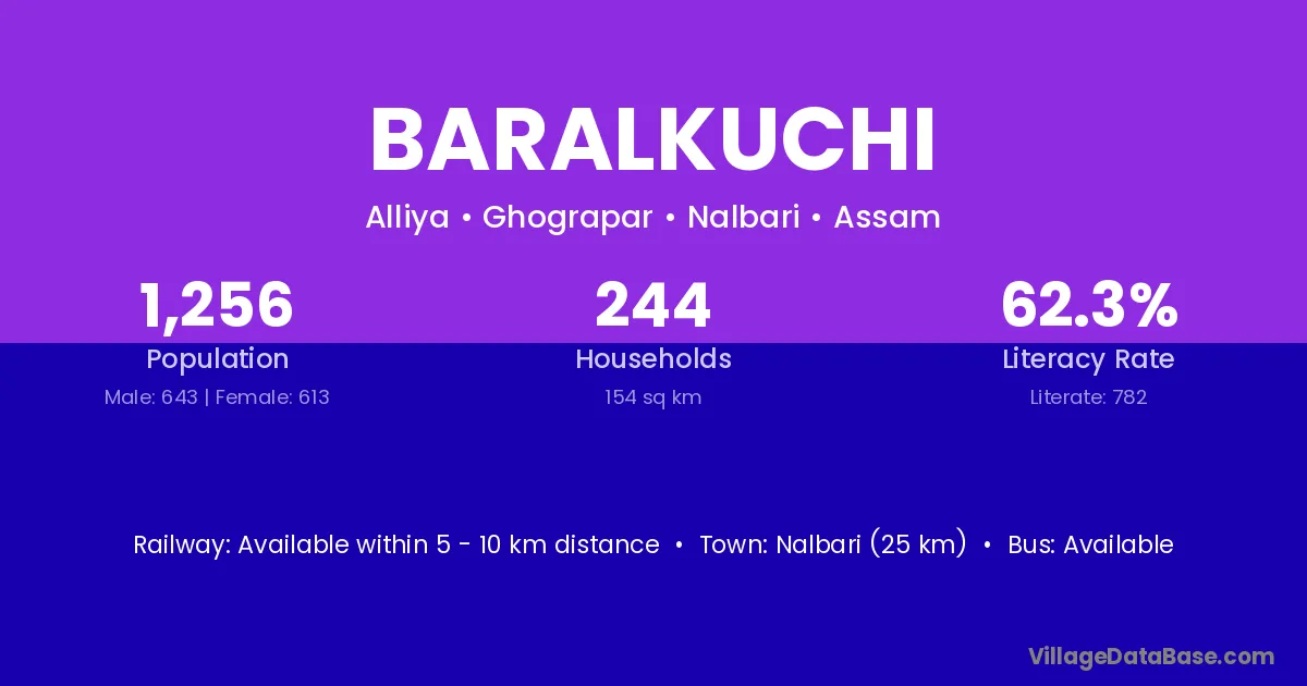 Nalbari (25 km) is the nearest town to Baralkuchi village for major economic activities and is located approximately 25 km away.