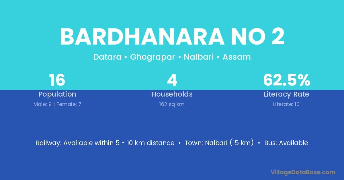 Nalbari (15 km) is the nearest town to Bardhanara No 2 village for major economic activities and is located approximately 15 km away.