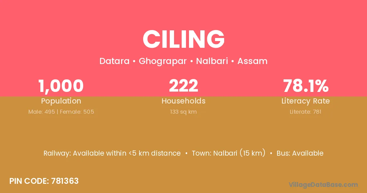 Nalbari (15 km) is the nearest town to Ciling village for major economic activities and is located approximately 15 km away.
