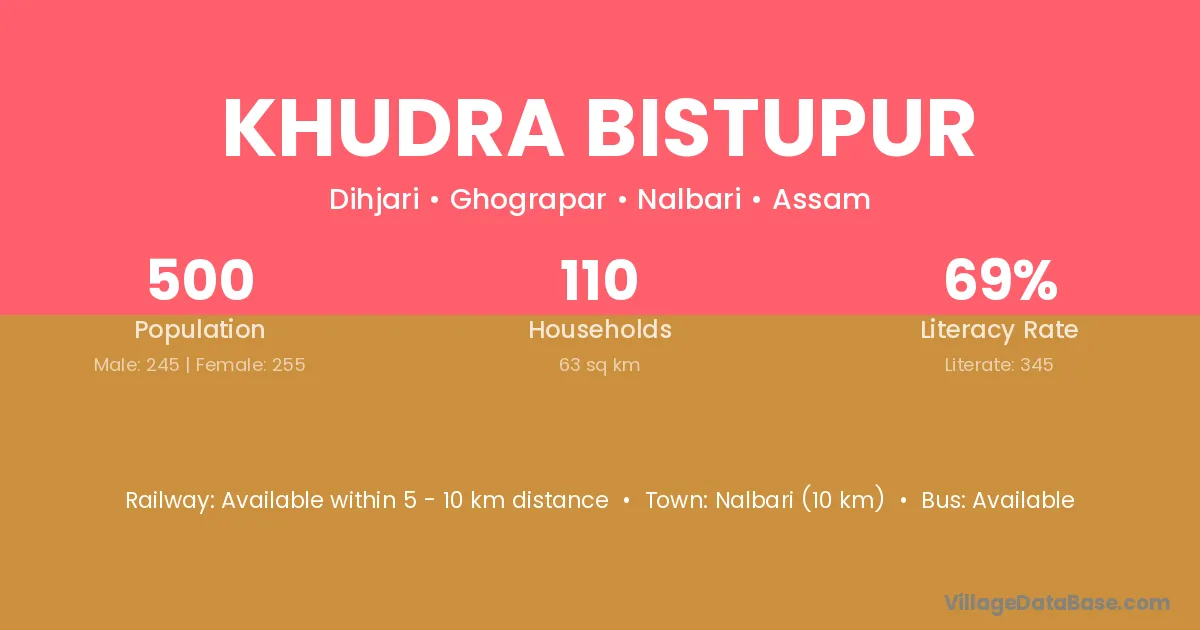 Nalbari (10 km) is the nearest town to Khudra Bistupur village for major economic activities and is located approximately 10 km away.