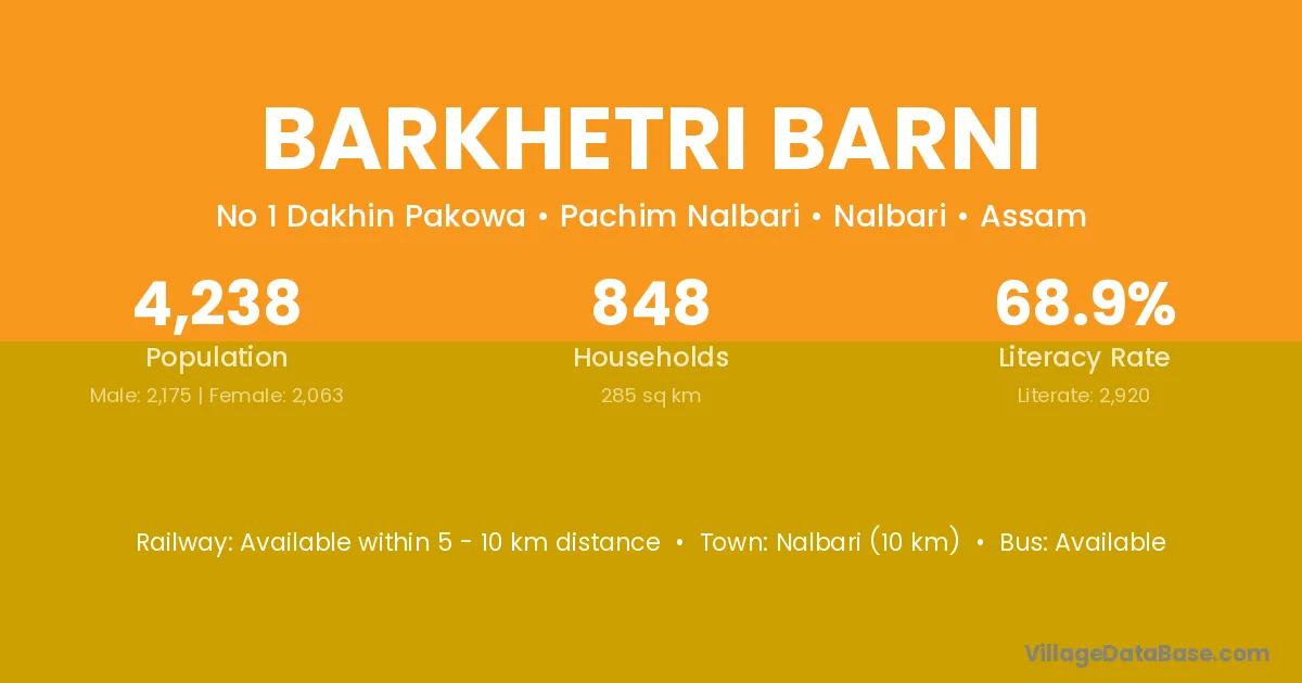 Nalbari (10 km) is the nearest town to Barkhetri Barni village for major economic activities and is located approximately 10 km away.