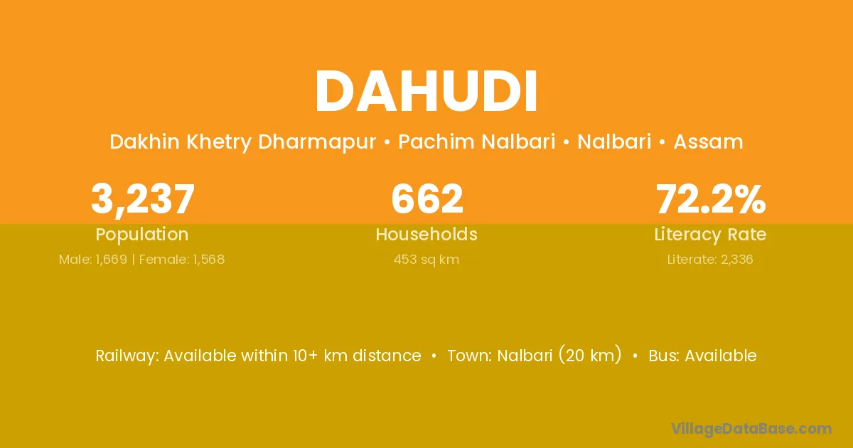 Nalbari (20 km) is the nearest town to Dahudi village for major economic activities and is located approximately 20 km away.