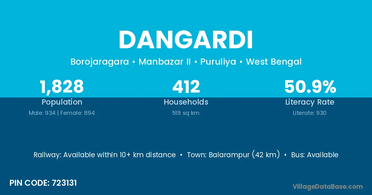 The literacy rate of Dangardi village is 68.24%. Male literacy stands at 75.14% and female literacy at 60.38%.