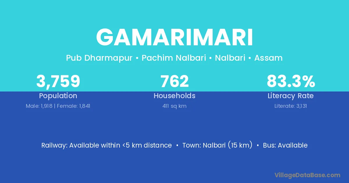 Nalbari (15 km) is the nearest town to Gamarimari village for major economic activities and is located approximately 15 km away.