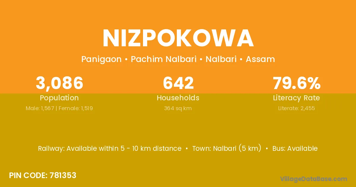 Nalbari (5 km) is the nearest town to Nizpokowa village for major economic activities and is located approximately 5 km away.