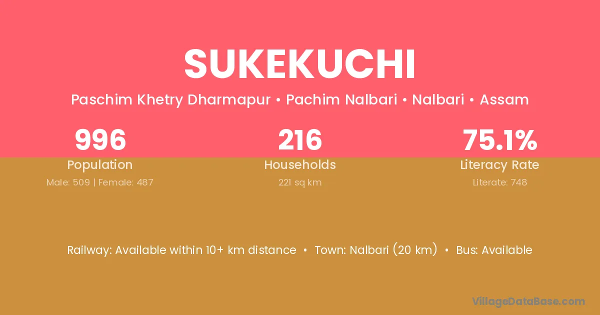 Nalbari (20 km) is the nearest town to Sukekuchi village for major economic activities and is located approximately 20 km away.