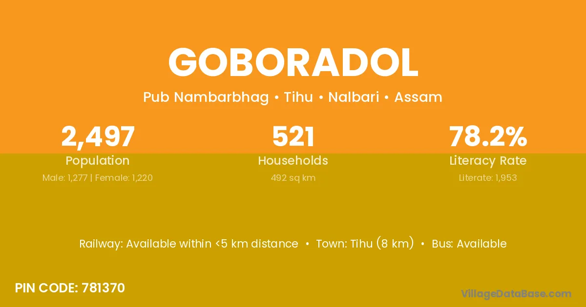 Tihu (8 km) is the nearest town to Goboradol village for major economic activities and is located approximately 8 km away.