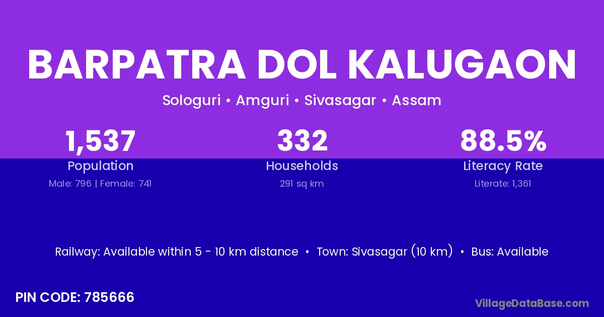 Barpatra Dol Kalugaon village has a total population of 1,537 people, of which 796 are males and 741 are females.