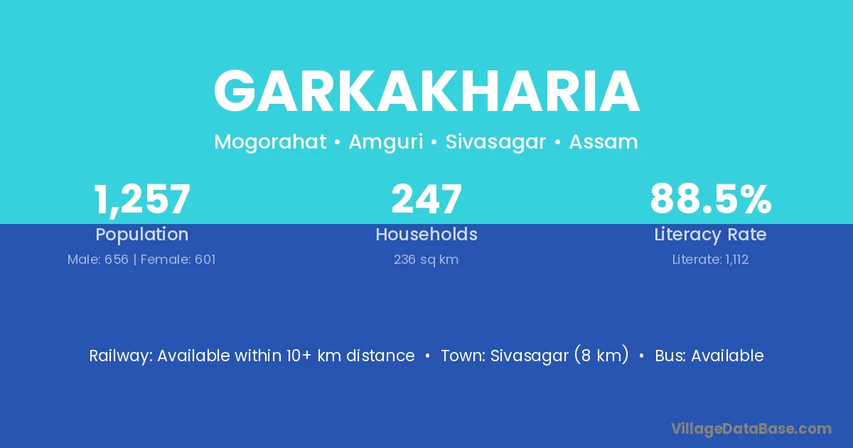 Sivasagar (8 km) is the nearest town to Garkakharia village for major economic activities and is located approximately 8 km away.