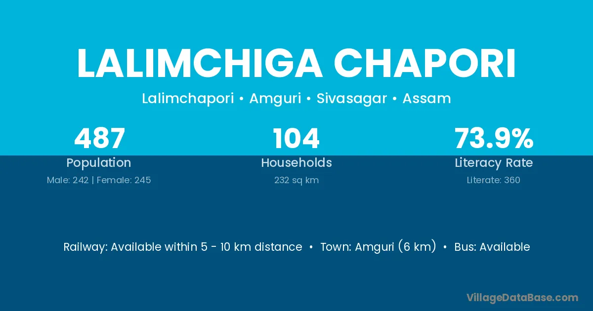 Amguri (6 km) is the nearest town to Lalimchiga Chapori village for major economic activities and is located approximately 6 km away.