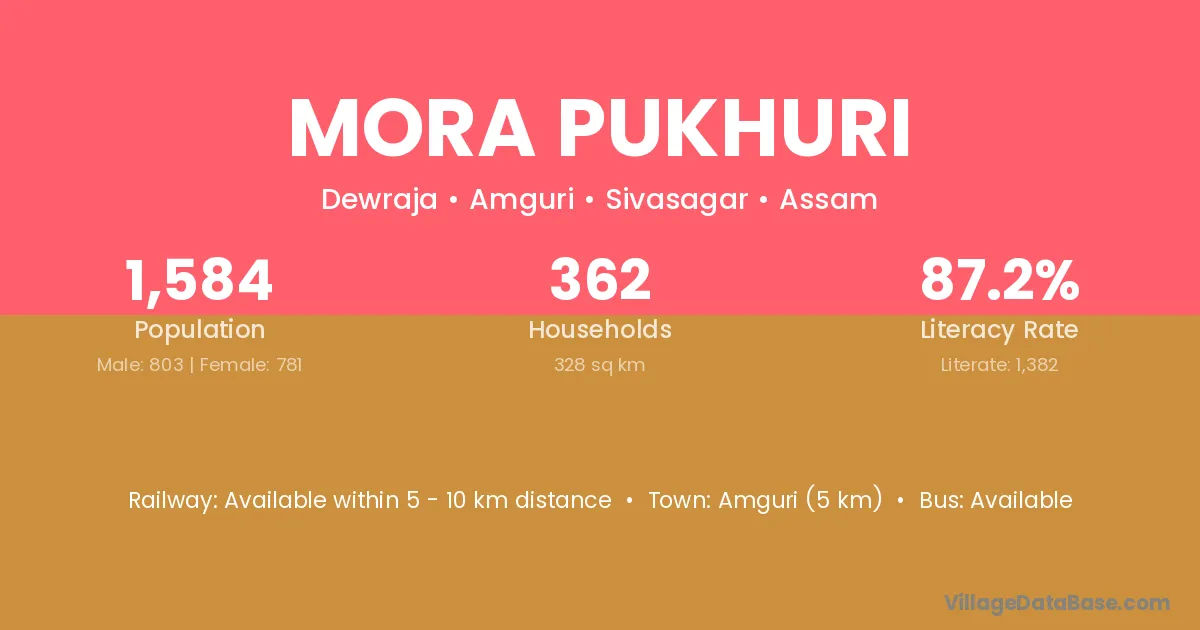 Amguri (5 km) is the nearest town to Mora Pukhuri village for major economic activities and is located approximately 5 km away.