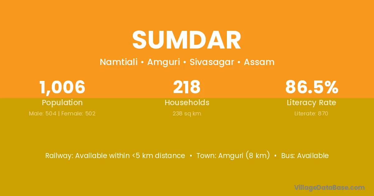 Amguri (8 km) is the nearest town to Sumdar village for major economic activities and is located approximately 8 km away.