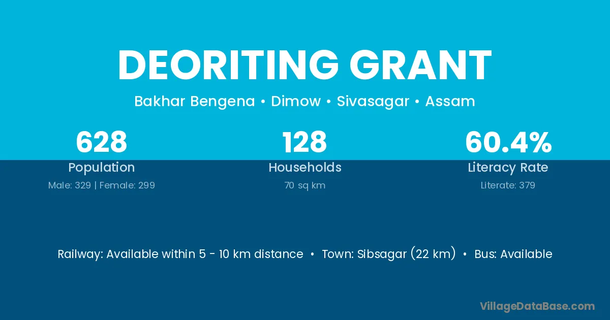 Sibsagar (22 km) is the nearest town to Deoriting Grant village for major economic activities and is located approximately 22 km away.