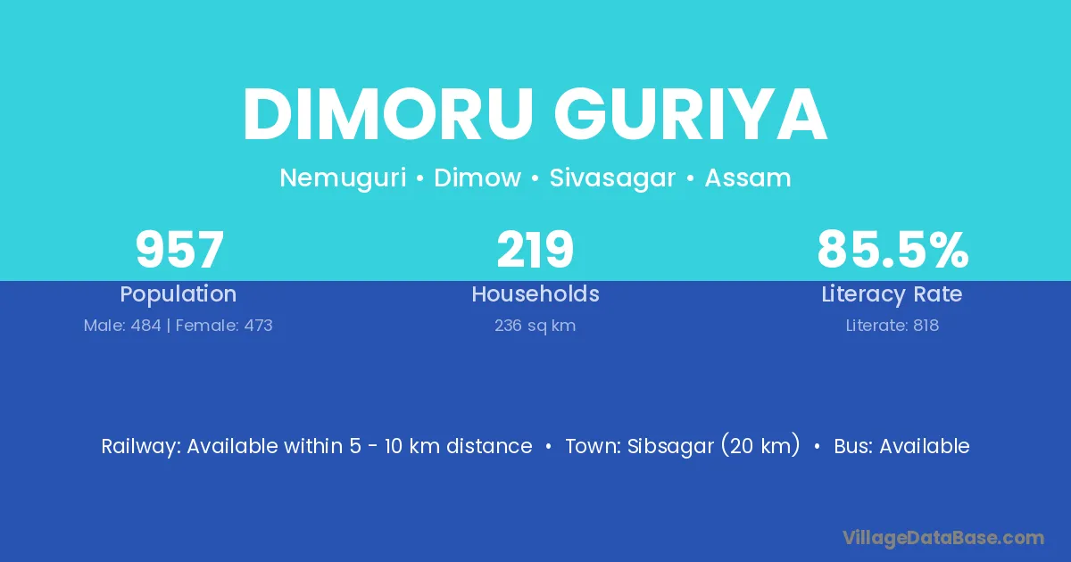 Dimoru Guriya village has a total population of 957 people, of which 484 are males and 473 are females.