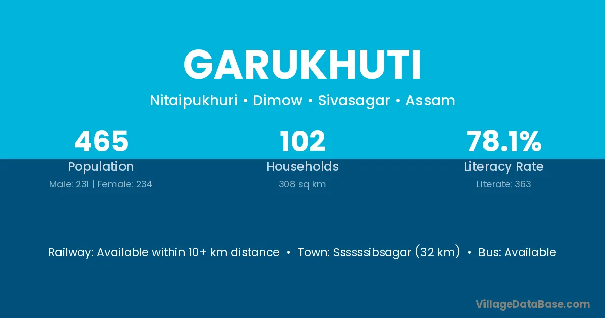 Ssssssibsagar (32 km) is the nearest town to Garukhuti village for major economic activities and is located approximately 32 km away.