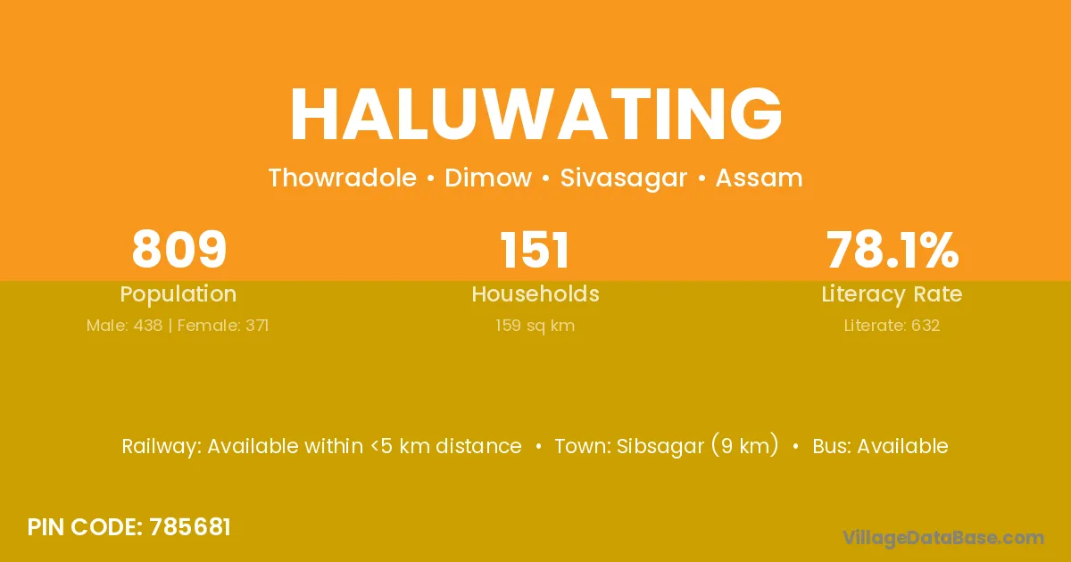 Sibsagar (9 km) is the nearest town to Haluwating village for major economic activities and is located approximately 9 km away.