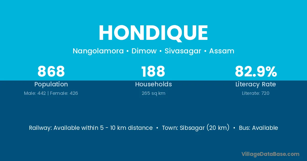 Sibsagar (20 km) is the nearest town to Hondique village for major economic activities and is located approximately 20 km away.