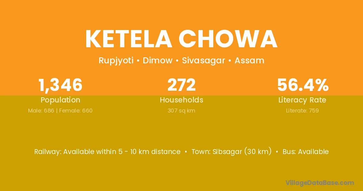 Sibsagar (30 km) is the nearest town to Ketela Chowa village for major economic activities and is located approximately 30 km away.