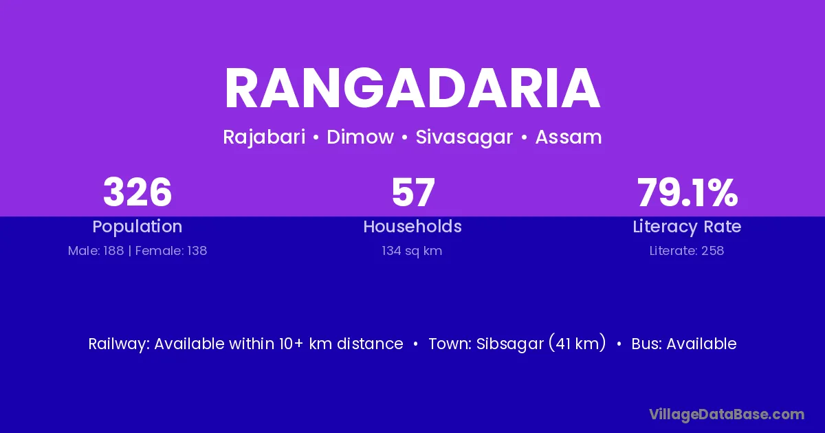 Sibsagar (41 km) is the nearest town to Rangadaria village for major economic activities and is located approximately 41 km away.