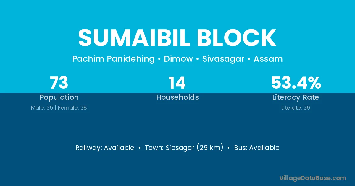 Sumaibil Block village has a total population of 73 people, of which 35 are males and 38 are females.