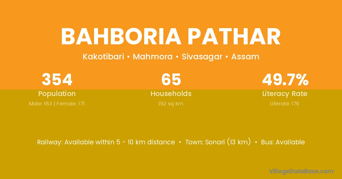 Sonari (13 km) is the nearest town to Bahboria Pathar village for major economic activities and is located approximately 13 km away.