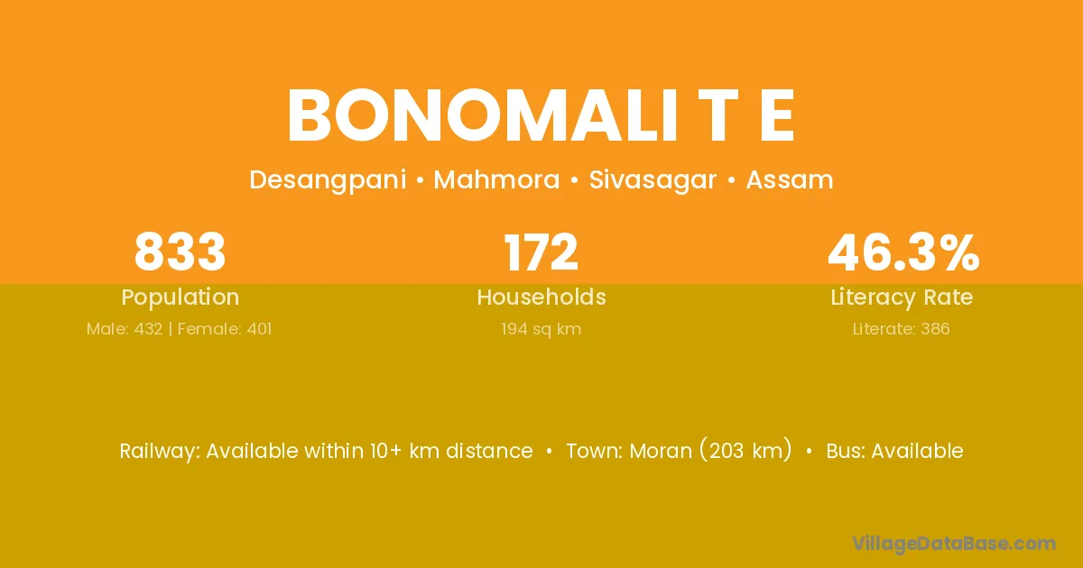 Bonomali T E village has a total population of 833 people, of which 432 are males and 401 are females.