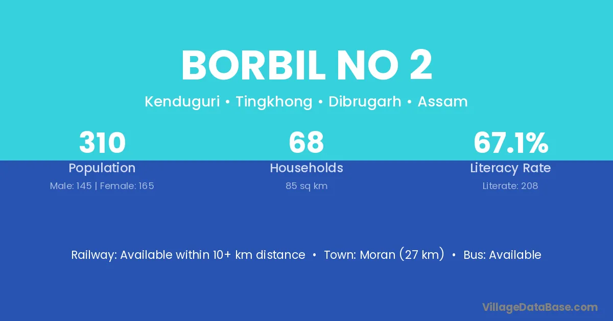 Moran (23 km) is the nearest town to Borbil No 2 village for major economic activities and is located approximately 23 km away.