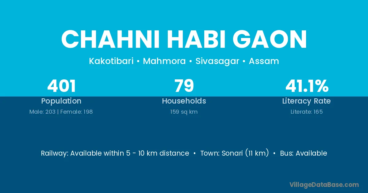 Sonari (11 km) is the nearest town to Chahni Habi Gaon village for major economic activities and is located approximately 11 km away.