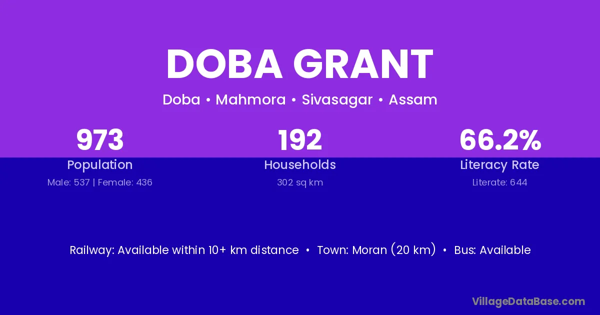 The literacy rate of Doba Grant village is 66.19%. Male literacy stands at 75.05% and female literacy at 55.28%.