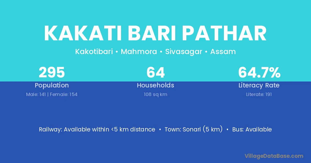 Kakati Bari Pathar village has a total population of 295 people, of which 141 are males and 154 are females.