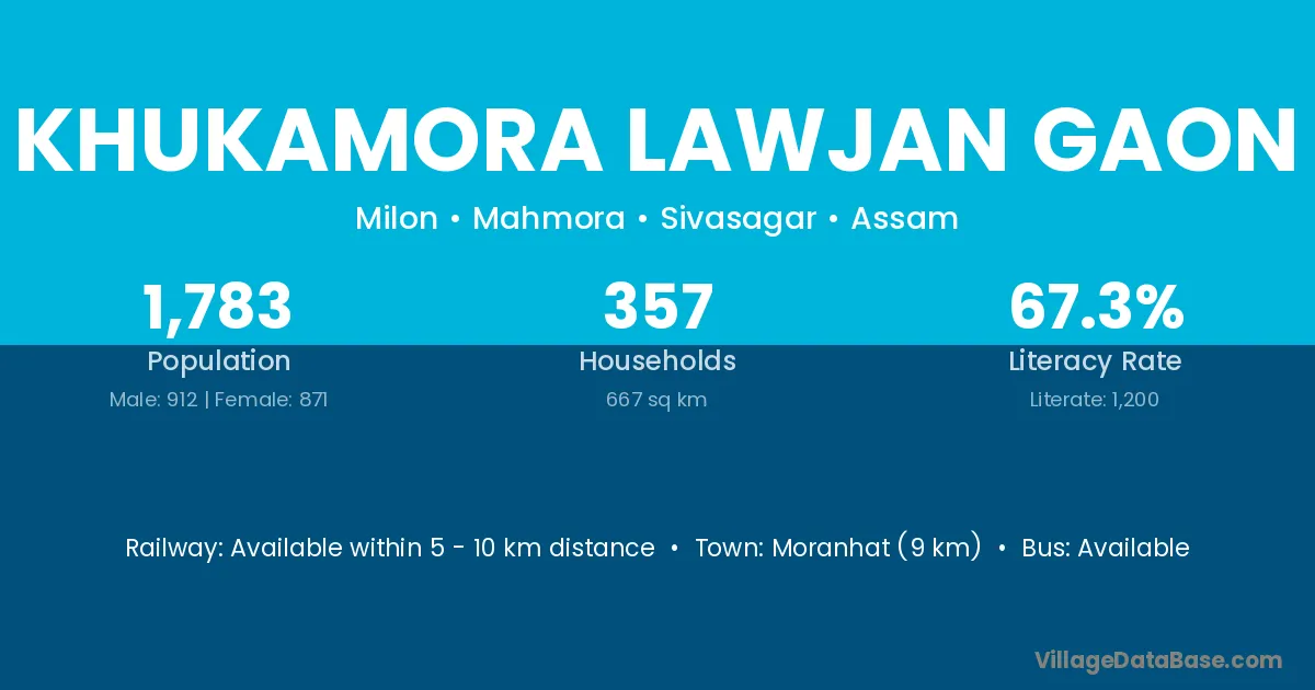 Khukamora Lawjan Gaon village has a total population of 1,783 people, of which 912 are males and 871 are females.