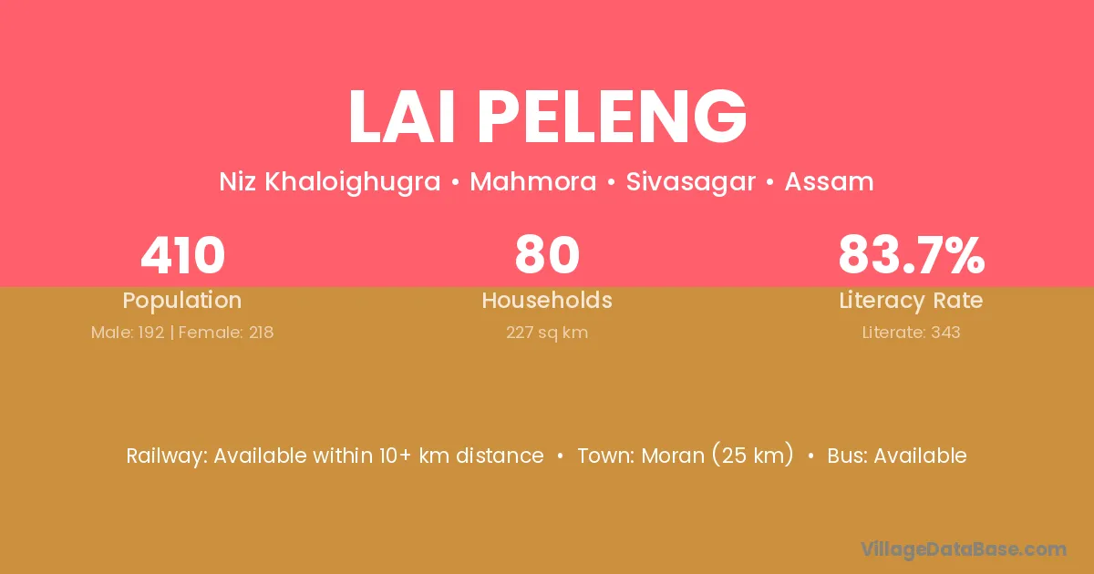 Lai Peleng village has a total population of 410 people, of which 192 are males and 218 are females.