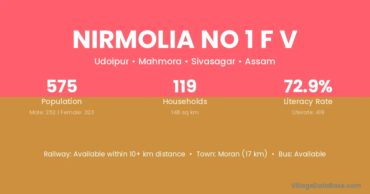 Moran (17 km) is the nearest town to Nirmolia No 1 F V village for major economic activities and is located approximately 17 km away.